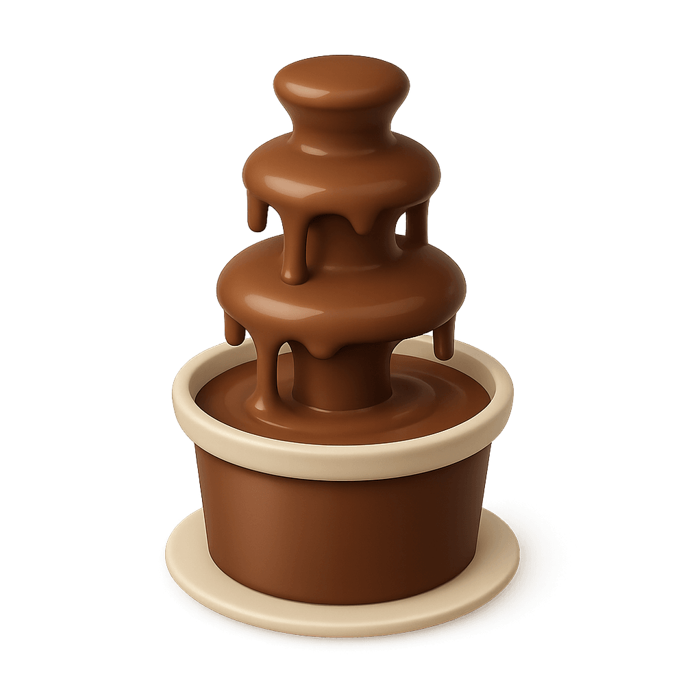 A chocolate fountain is a decorative structure designed to serve flowing melted chocolate, often used as a centerpiece at events and gatherings. Guests can dip fruits, pastries, or other treats into the cascading chocolate for a fun and interactive dessert experience.