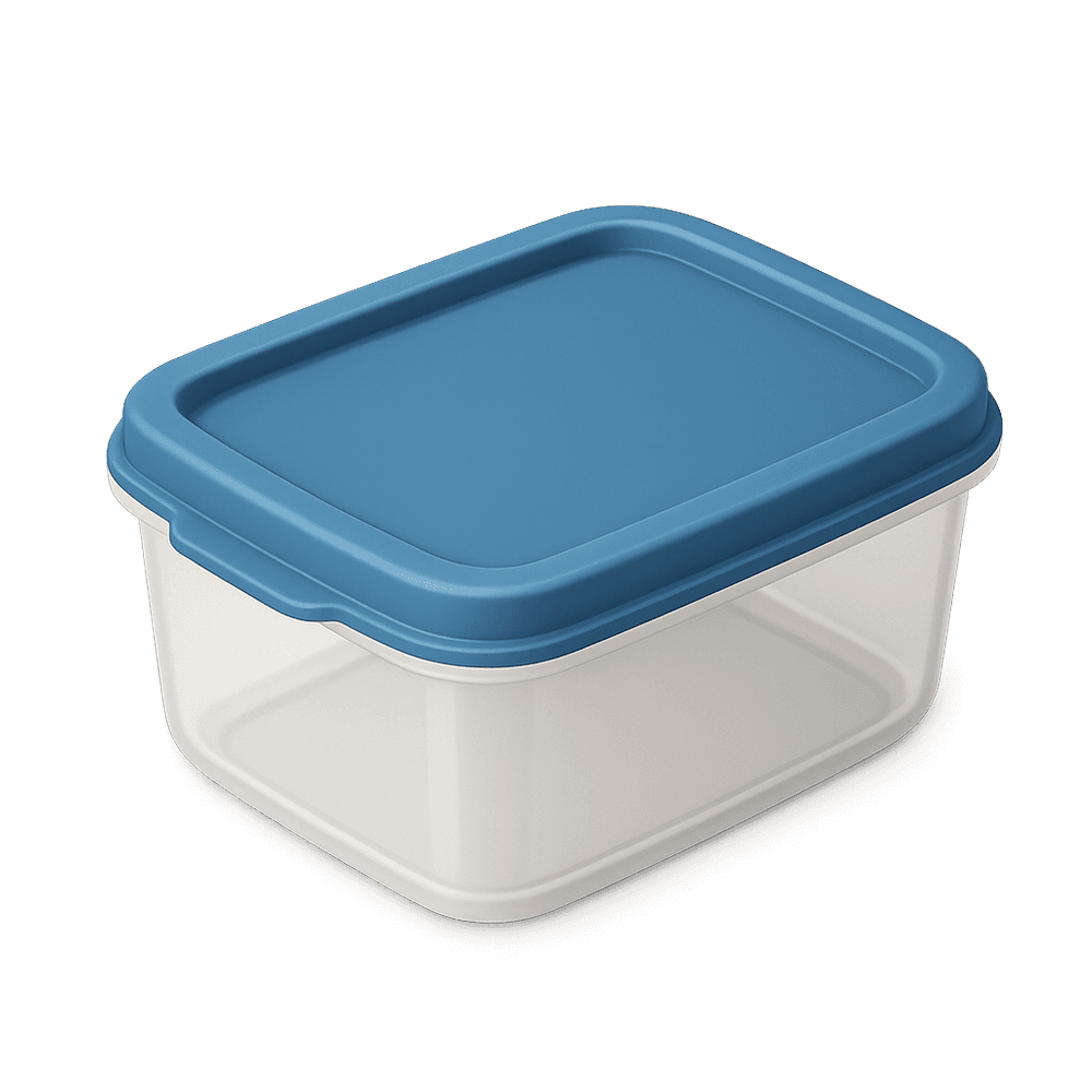 A clear, reusable plastic container commonly used for storing food and organizing household items. Tupperware is known for its airtight seal, keeping contents fresh and easy to identify.