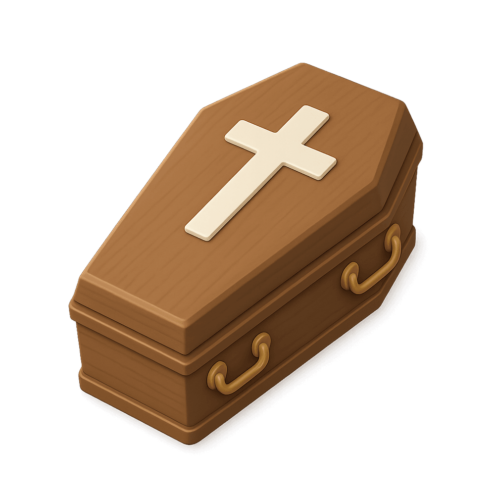A coffin is a box or container used to hold a deceased person's body for burial or cremation. It is an essential object in funeral practices across many cultures, symbolizing respect and care for the dead.