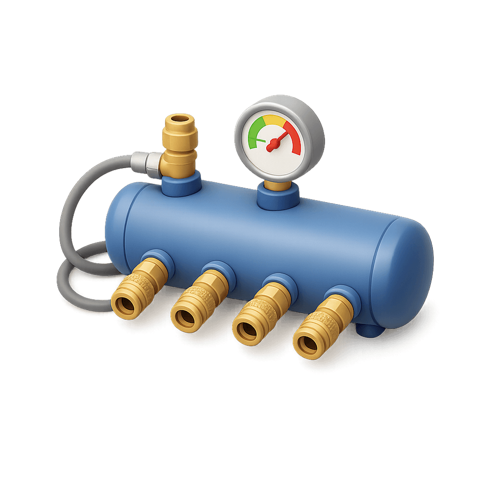 A compressed air manifold is a device used to distribute compressed air from a single source to multiple outputs, commonly found in industrial and workshop settings for powering pneumatic tools and equipment.
