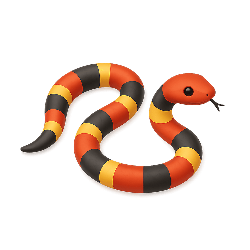 The coral snake is a small, brightly colored venomous snake known for its distinctive red, yellow, and black banding. Found in the Americas, it is famous for its potent neurotoxic venom and is often confused with non-venomous mimics. Coral snakes are secretive and rarely seen, preferring to hide under leaf litter or logs.