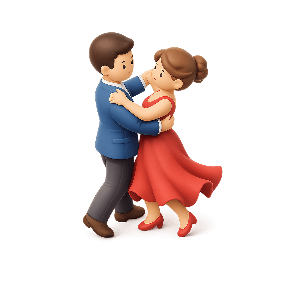 A pair of people moving rhythmically together to music, often as a form of social interaction, performance, or celebration. Couple dancing includes styles like waltz, tango, salsa, and swing, and is popular at parties, events, and dance competitions.