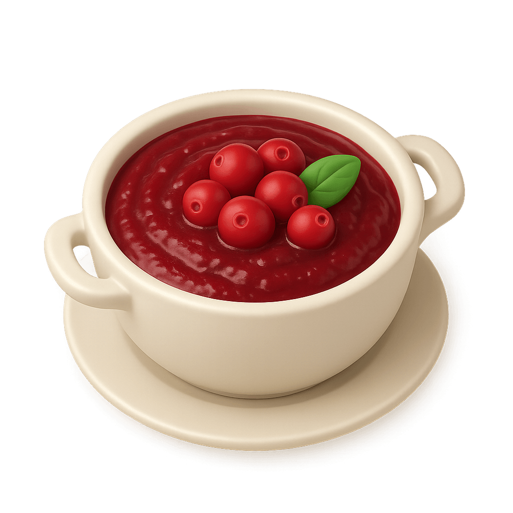 A sweet and tangy sauce made from cranberries, commonly served as a condiment or side dish during holiday meals, especially Thanksgiving. It pairs well with turkey and other savory dishes.