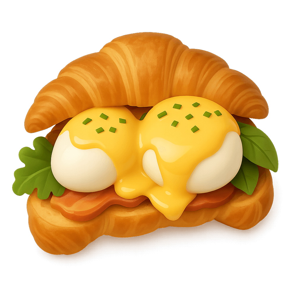 A gourmet breakfast dish featuring poached eggs and hollandaise sauce served on a buttery croissant, often accompanied by ham or smoked salmon. Combines classic Eggs Benedict with a French pastry twist.