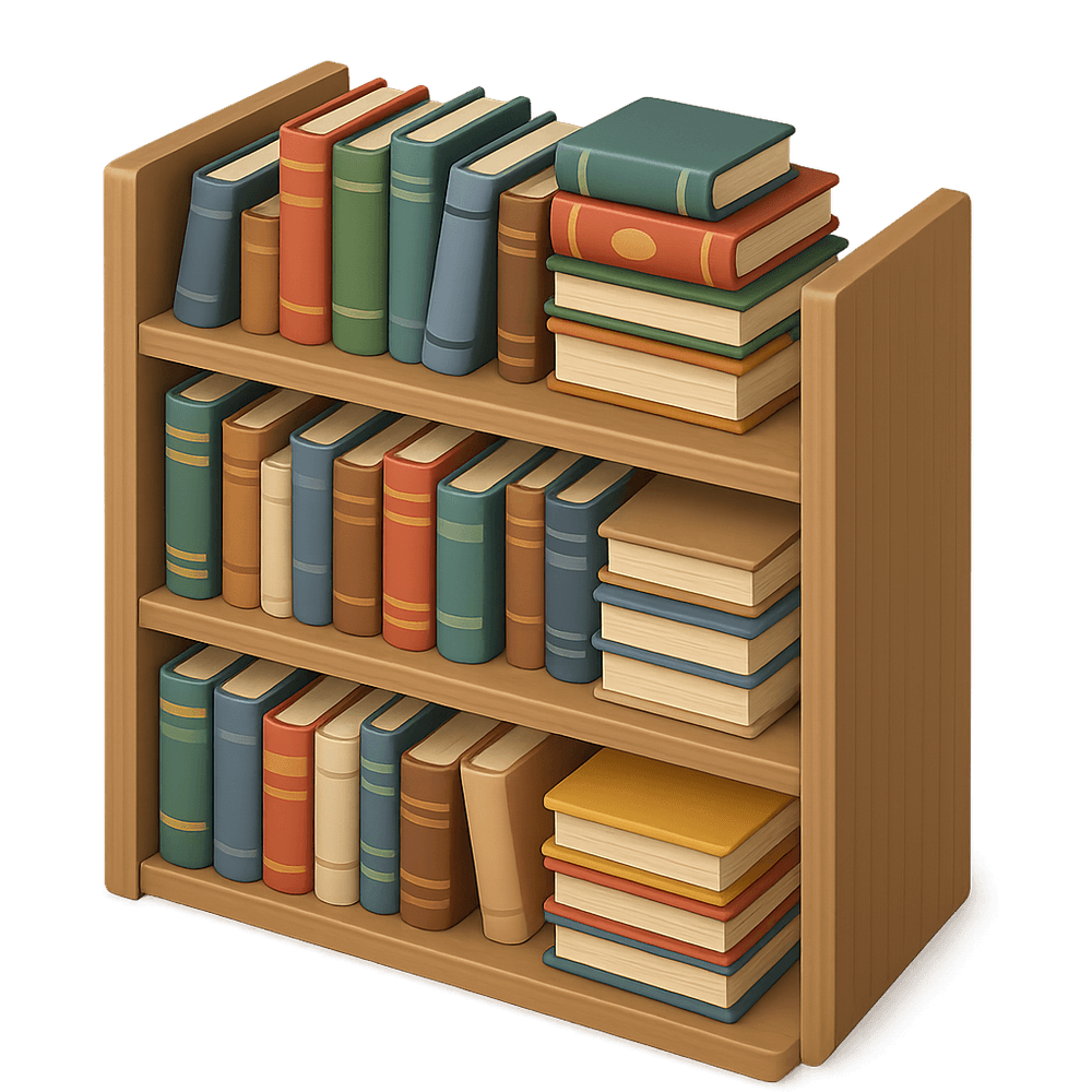 A crowded bookshelf is packed with books of various sizes and genres, often overflowing or stacked in multiple rows. It reflects a love of reading, learning, and sometimes a bit of disorganization in everyday life.