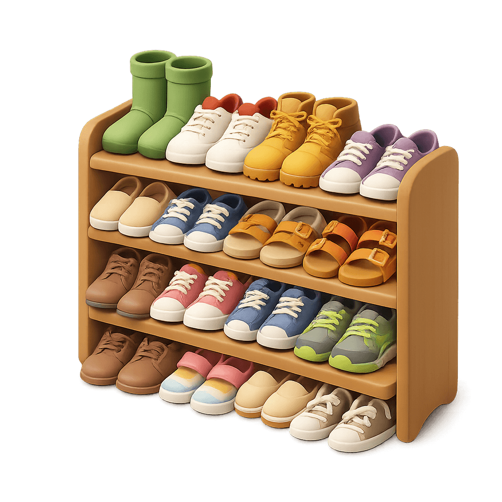 A crowded shoe rack is a storage unit filled to capacity with various pairs of shoes, often found in entryways or closets. It reflects the challenges of organization and limited space in everyday life.