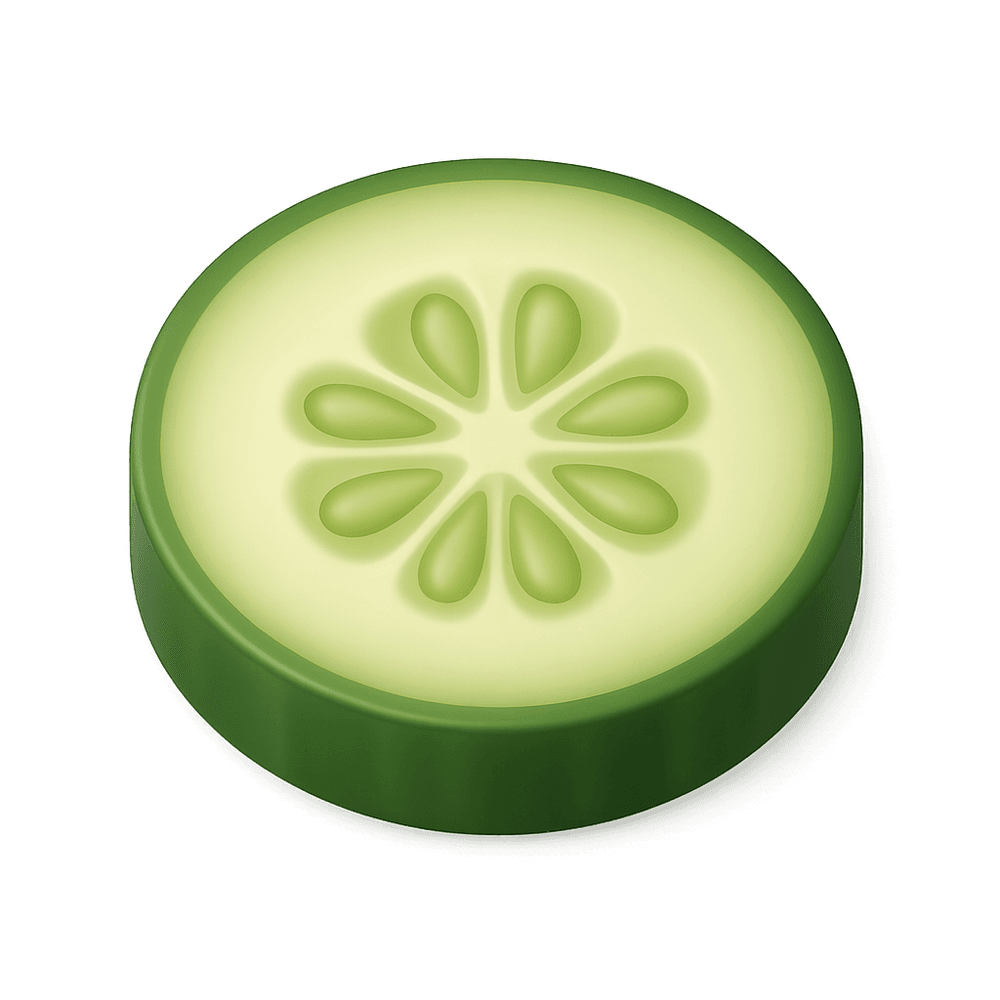 A thin, round piece of cucumber, commonly used in salads, sandwiches, or as a garnish. Crisp, refreshing, and low in calories.