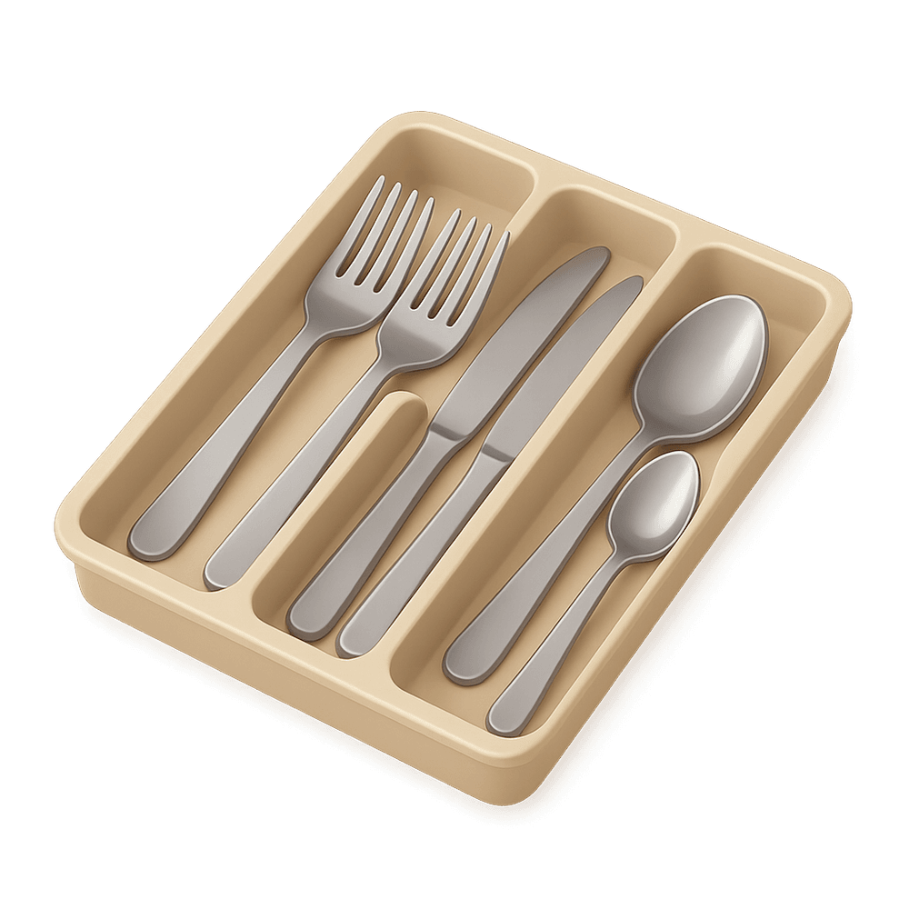 A cutlery tray is a compartmentalized organizer designed to hold and separate utensils such as forks, knives, and spoons, typically placed in kitchen drawers for easy access and organization.