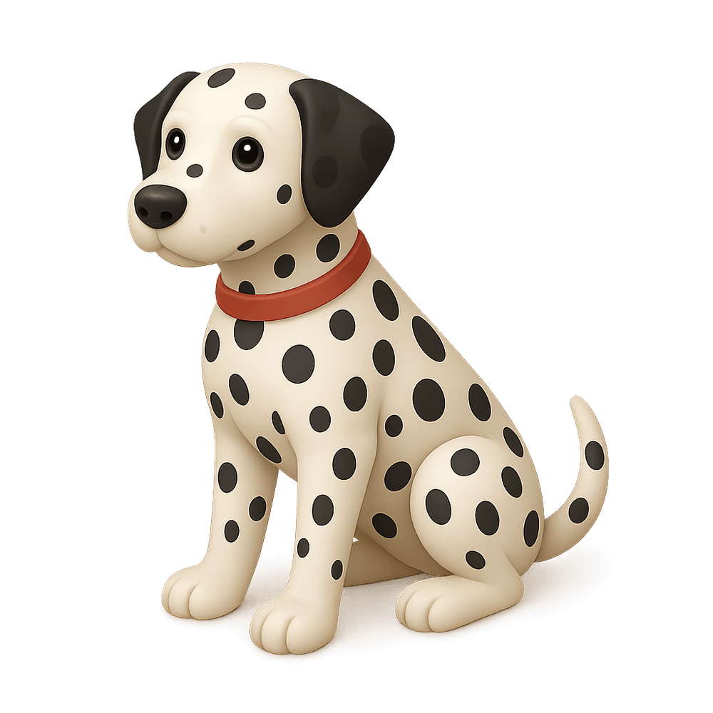 A Dalmatian is a medium-sized breed of dog known for its distinctive white coat with black or liver spots. Originally bred as a carriage dog, Dalmatians are energetic, intelligent, and friendly, making them popular pets and working dogs.