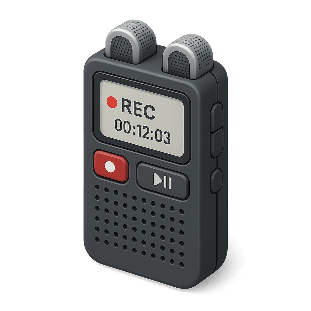 A compact electronic device used to record, store, and play back audio, commonly used for interviews, lectures, and personal notes.