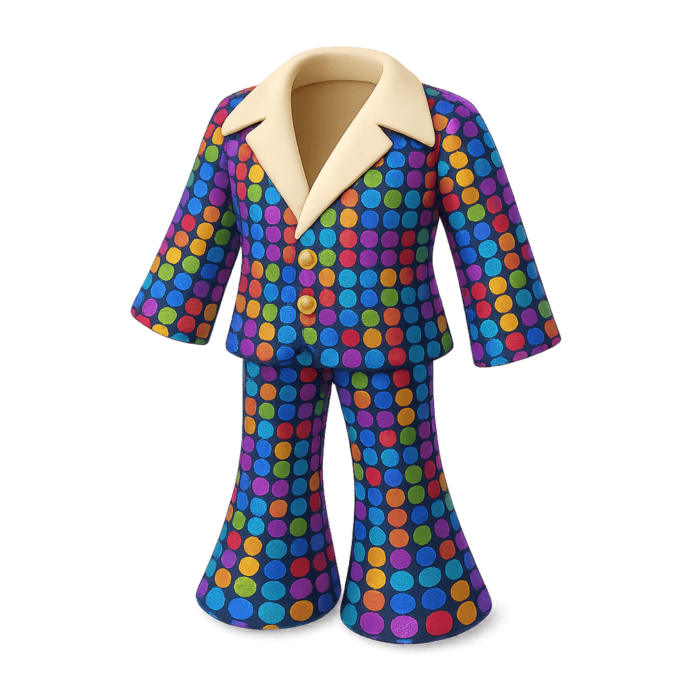 A flashy, sequined outfit designed for dancing and making a statement on the dance floor, popularized during the disco era of the 1970s. Often features bold colors, metallic fabrics, and flared pants or sleeves.
