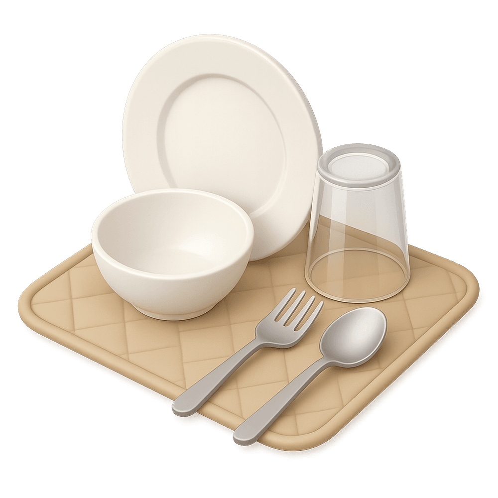 A dish drying mat is an absorbent mat placed on countertops to air-dry dishes, glasses, and utensils after washing. It helps protect surfaces from water and keeps kitchens tidy.