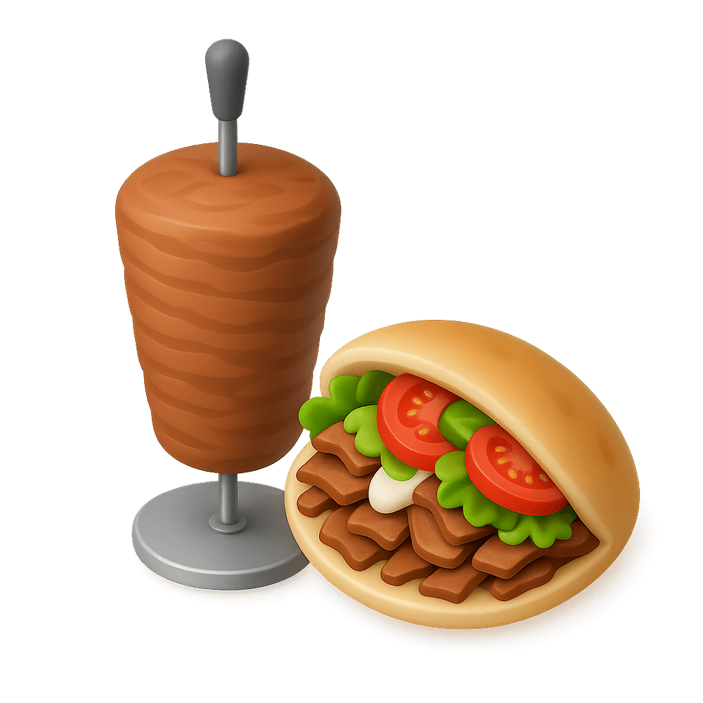A Döner Kebab is a popular Turkish street food consisting of seasoned meat (usually lamb, beef, or chicken) cooked on a vertical rotisserie, sliced thin, and served in pita or flatbread with vegetables and sauces.
