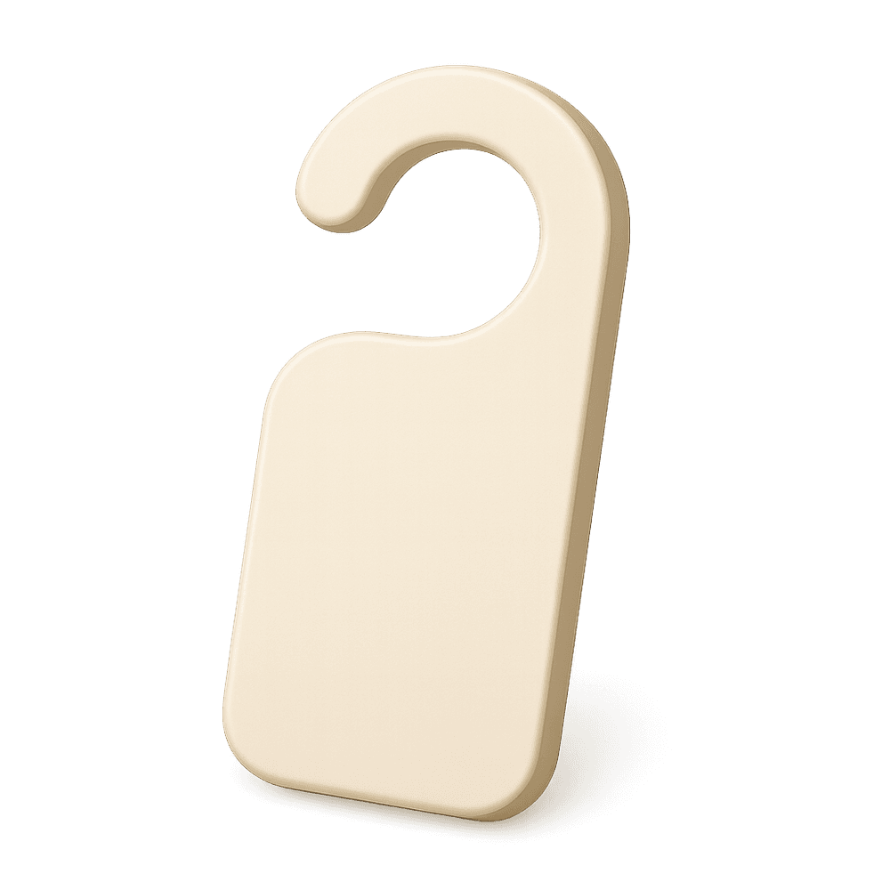 A door hanger is a small sign or decorative item designed to hang from a door handle. It is commonly used to convey messages such as 'Do Not Disturb,' 'Welcome,' or other notifications in homes, hotels, and offices.