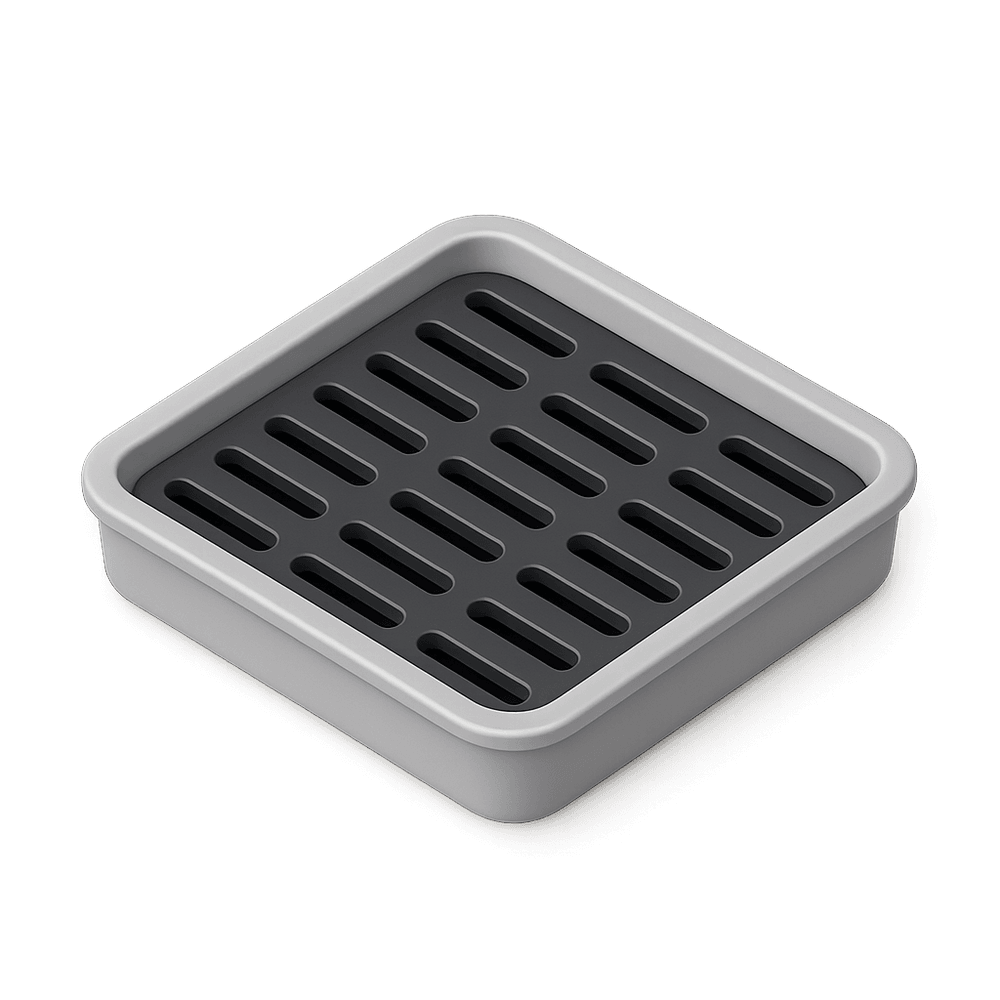 A drip tray is a shallow container placed beneath objects like coffee machines, dish racks, or grills to catch excess liquid, spills, or drips, helping to keep surfaces clean and dry in everyday settings.
