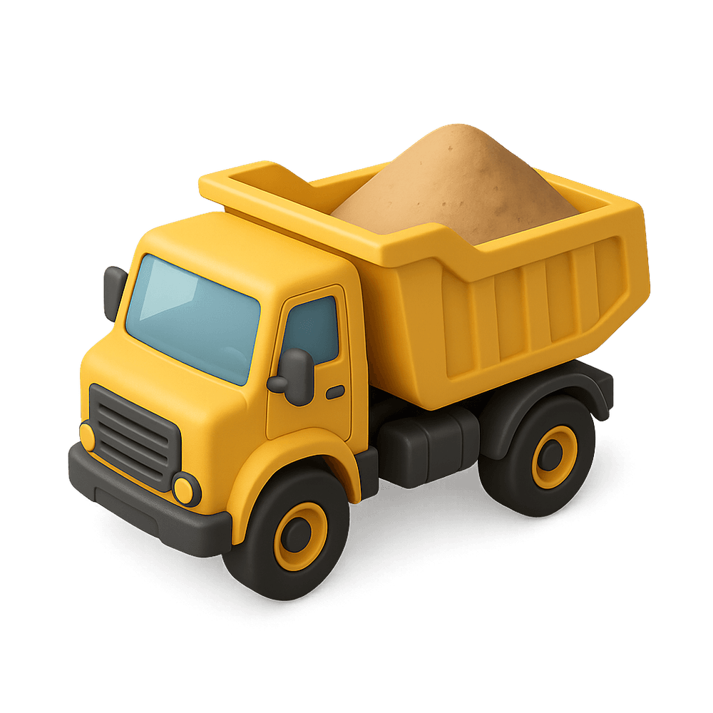 A dump truck is a large vehicle used for transporting loose materials such as sand, gravel, or demolition waste for construction. It features an open-box bed, which is hinged at the rear and equipped with hydraulic rams to lift the front, allowing the material to be deposited on the ground behind the truck at the delivery site.