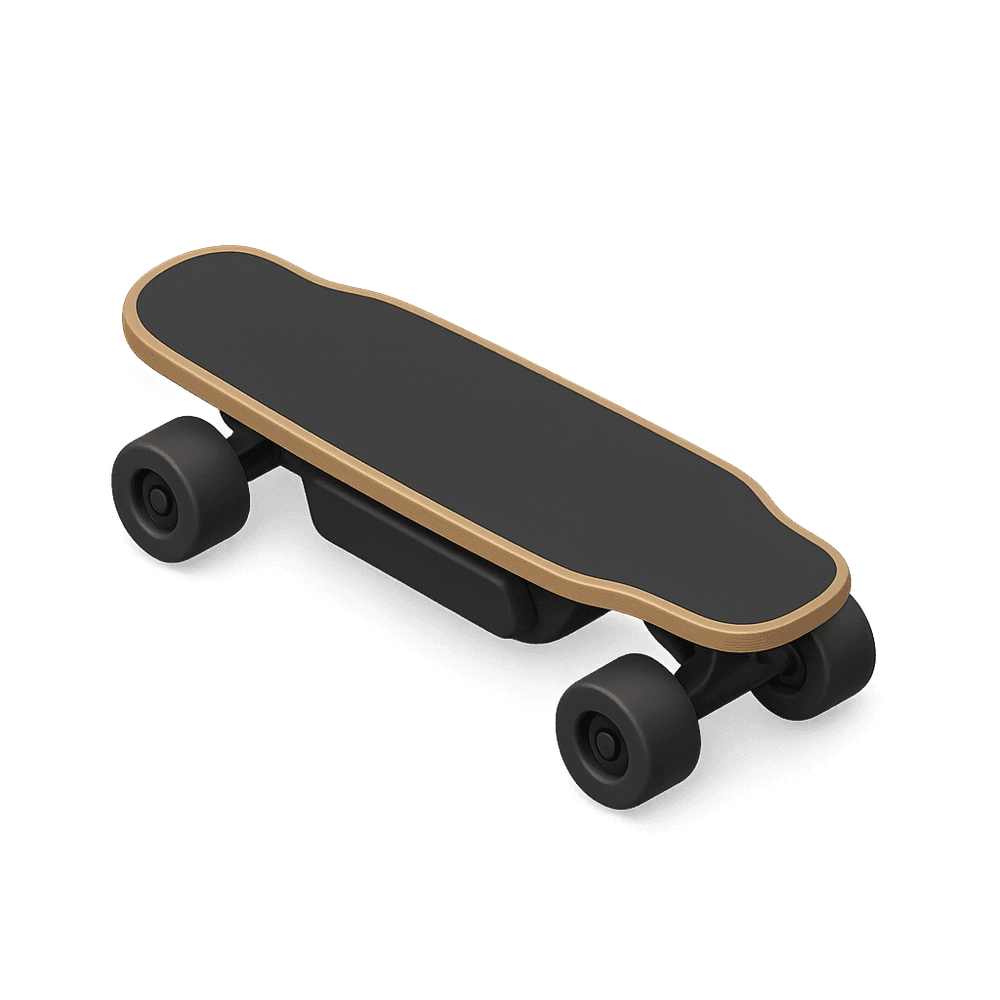 A compact, battery-powered skateboard designed for personal urban transportation. It features a wireless handheld remote for speed control and regenerative braking, making it an eco-friendly and fun way to commute short distances.