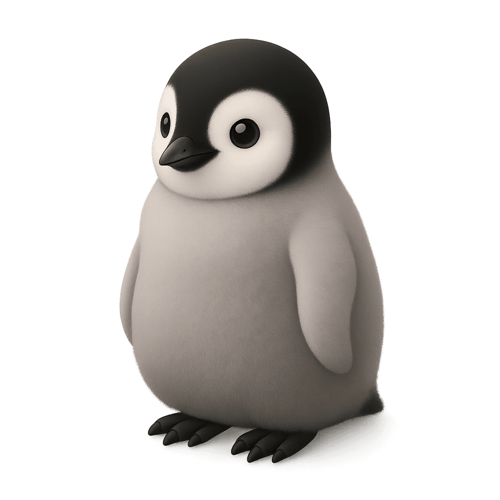 A fluffy, grey-and-white young Emperor Penguin, known for its soft down feathers and dependence on its parents in the harsh Antarctic environment. Emperor Penguin chicks are iconic symbols of survival and adaptation in extreme cold.