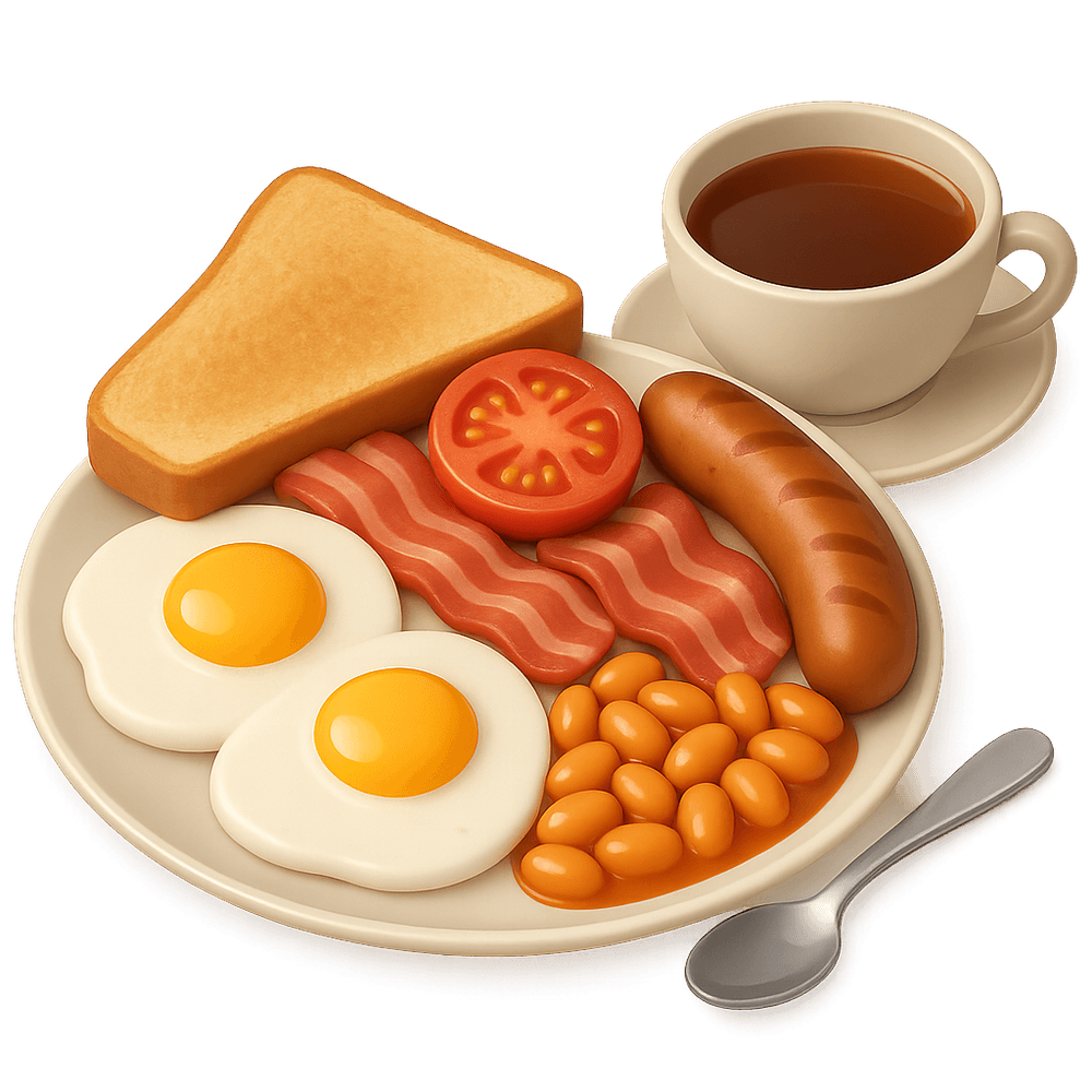 A traditional British breakfast typically consisting of eggs, bacon, sausages, baked beans, grilled tomatoes, mushrooms, toast, and sometimes black pudding. It is a hearty and iconic meal often served with tea or coffee.