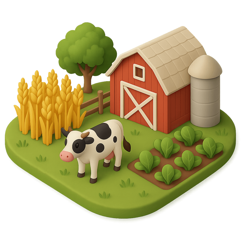 A farm is a rural area of land used for growing crops and raising animals, often including fields, barns, and other agricultural structures. Farms are essential for food production and agriculture.
