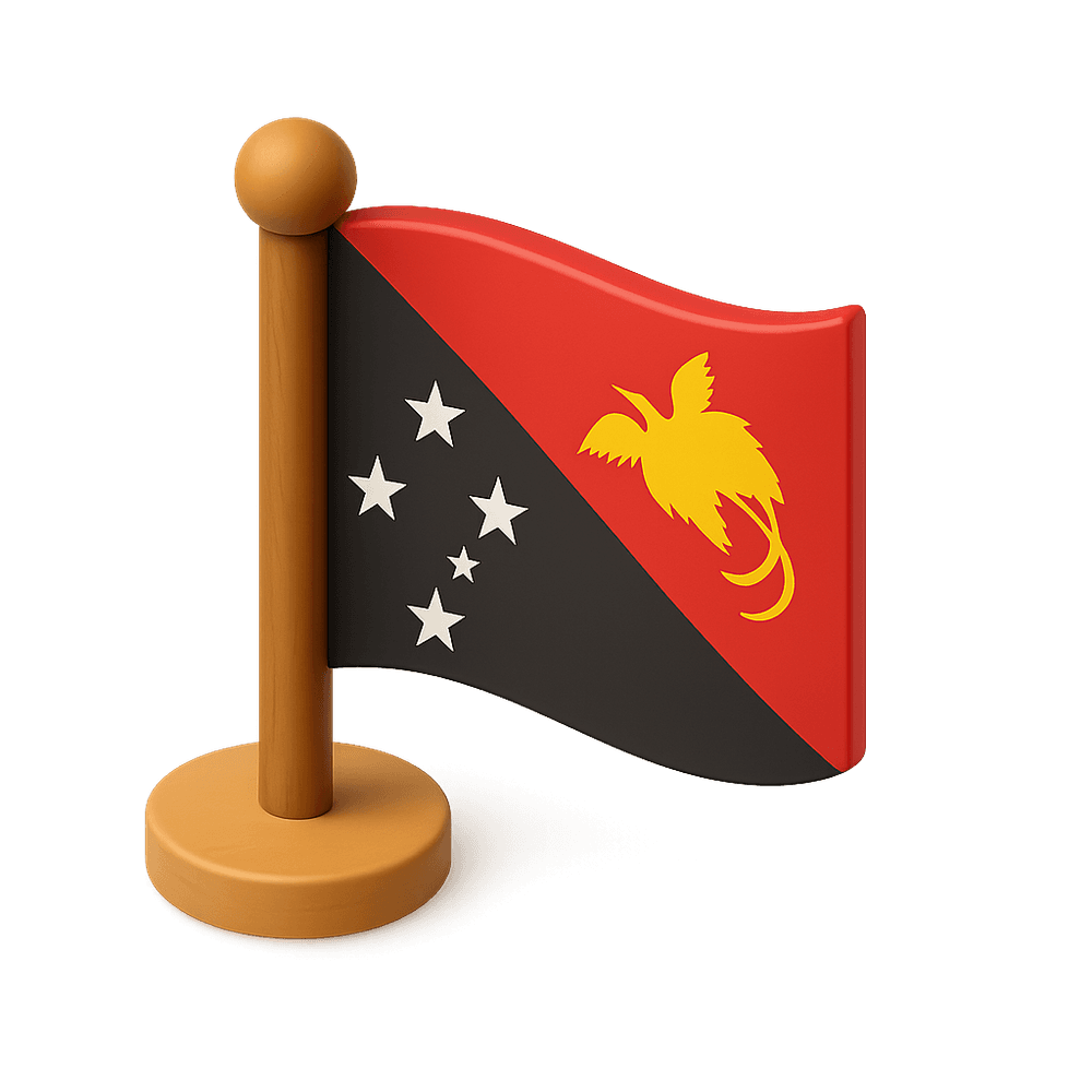 The national flag of Papua New Guinea features a unique diagonal design with a golden bird-of-paradise and the Southern Cross constellation, symbolizing the country's cultural heritage and connection to the Southern Hemisphere.