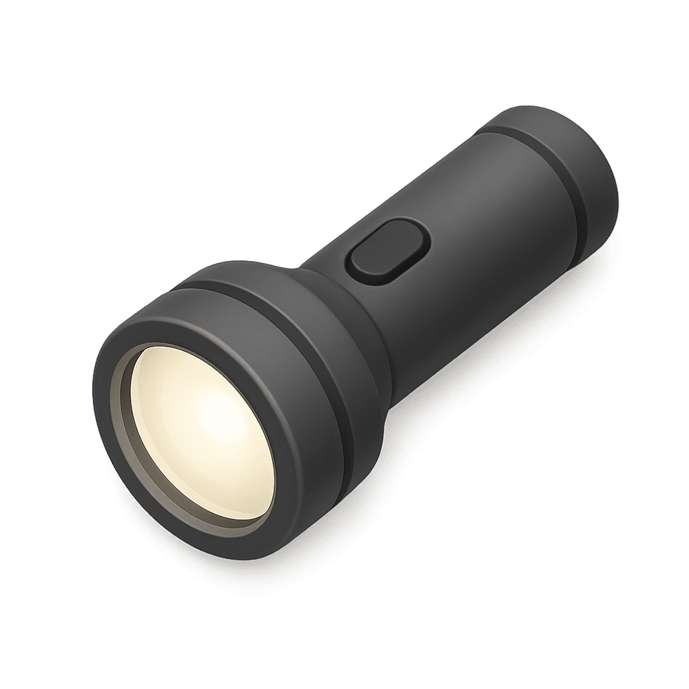 A portable handheld device that emits light, typically powered by batteries. Used for illumination in dark areas or during power outages, and is a common tool in households, cars, and outdoor activities.