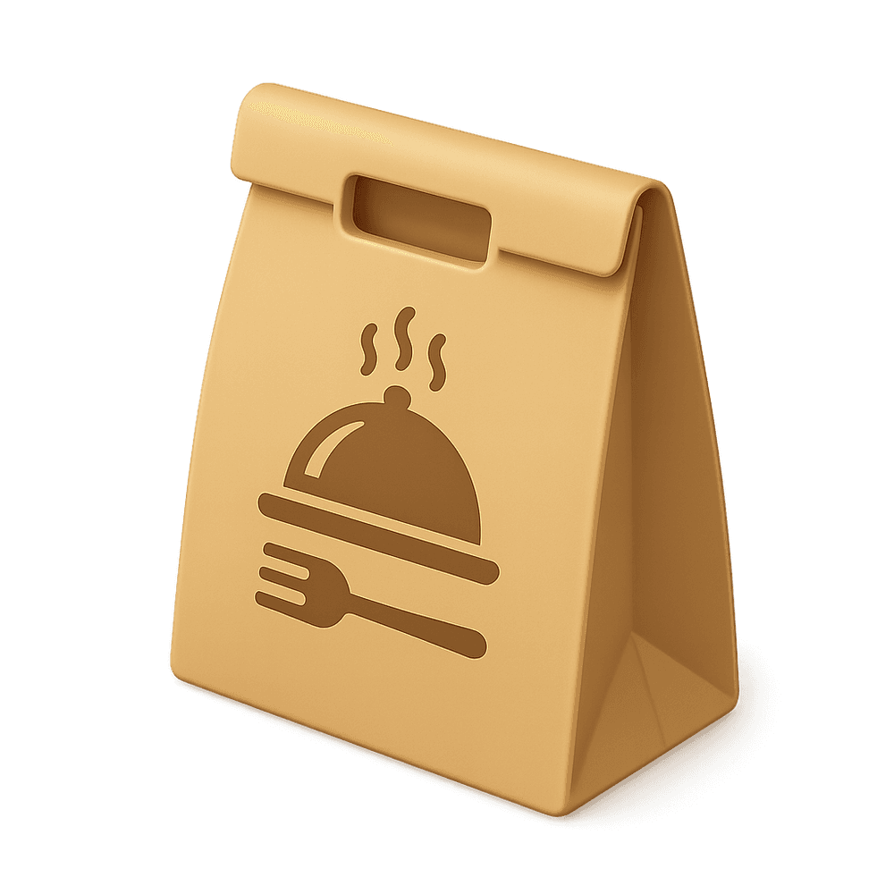 A disposable paper bag designed for carrying and delivering food orders from restaurants to customers. Commonly used by food delivery services to keep meals organized and protected during transport.