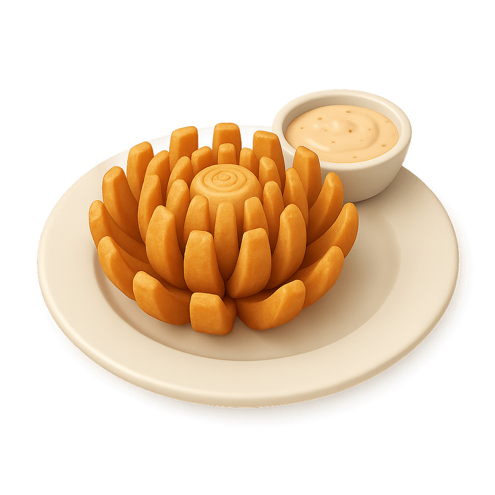 A Fried Onion Bloom is a whole onion cut to resemble a flower, battered, deep-fried, and served as a crispy, shareable appetizer, often with a savory dipping sauce. Popular in casual dining and known for its unique presentation.