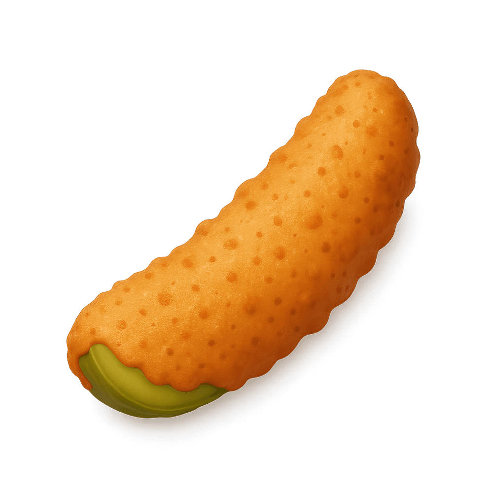 A Fried Pickle Spear is a tangy pickle spear coated in seasoned batter and deep-fried until crispy, often served as a savory appetizer or snack in restaurants and bars.