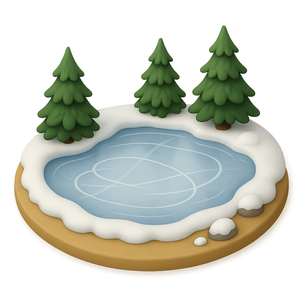A frozen pond is a natural body of water that has solidified due to cold temperatures, creating a smooth, icy surface. It is often found in outdoor environments during winter and can serve as a habitat for wildlife or a site for recreational activities like ice skating.