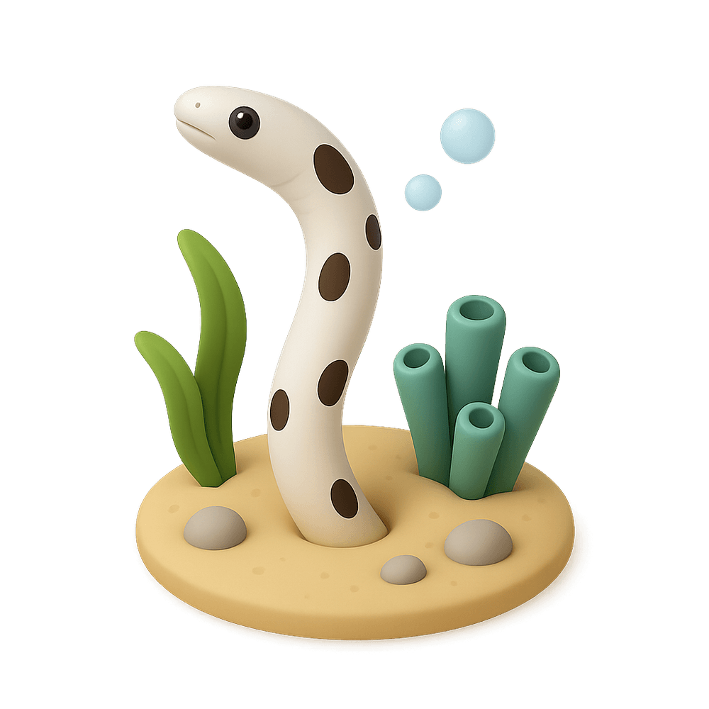 A slender, burrowing fish found in sandy ocean floors, garden eels live in colonies and sway with the current while partially emerging from their burrows. They are known for their unique appearance and social behavior.