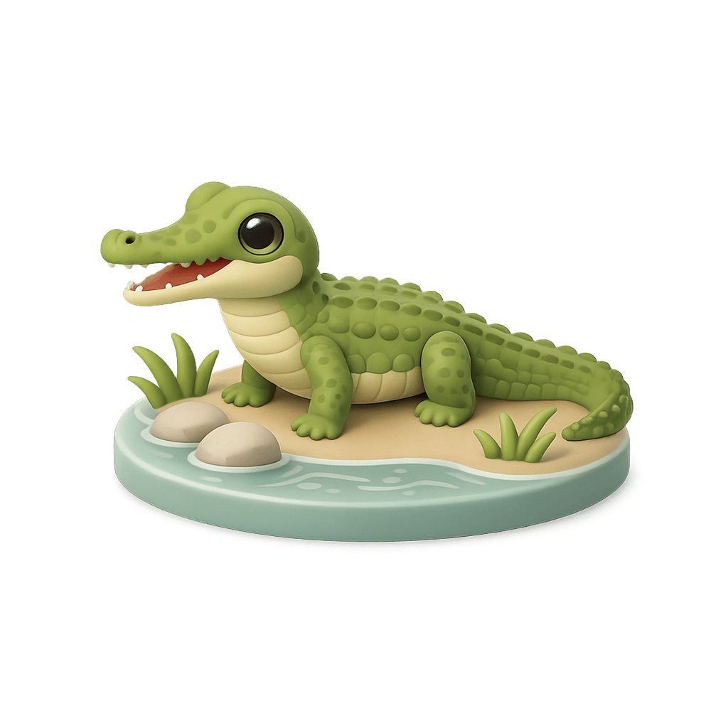 A young gharial, a critically endangered crocodilian native to the rivers of the Indian subcontinent. Gharial hatchlings are known for their slender snouts and aquatic lifestyle, relying on freshwater habitats for survival.
