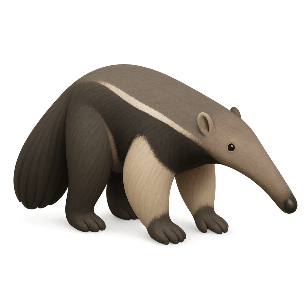 A large, insect-eating mammal native to Central and South America, known for its elongated snout and long, bushy tail. The giant anteater uses its sticky tongue to feed primarily on ants and termites.