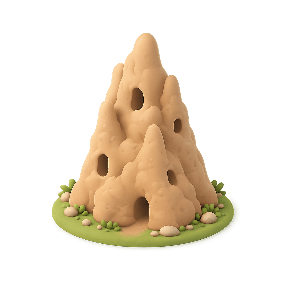 A giant termite mound is a towering structure built by termites, often reaching several meters in height. These natural marvels are made from soil, saliva, and dung, and serve as both a home and a climate control system for the termite colony. Found in savannas and forests, they are a striking example of insect engineering and ecosystem impact.