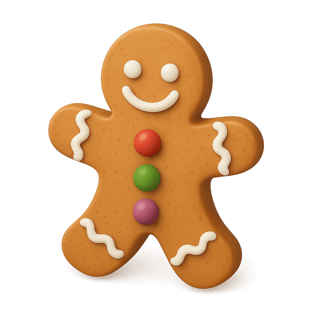 A Gingerbread Man is a cookie shaped like a human figure, typically made from gingerbread dough and decorated with icing and candies. Popular during the holiday season, especially Christmas, it is both a festive treat and a decorative item.
