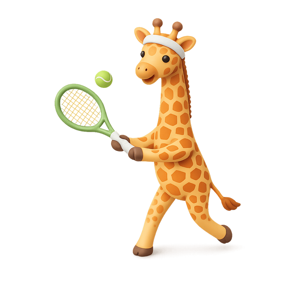 A tall giraffe skillfully playing tennis, blending wildlife with sports in a humorous and imaginative scene.