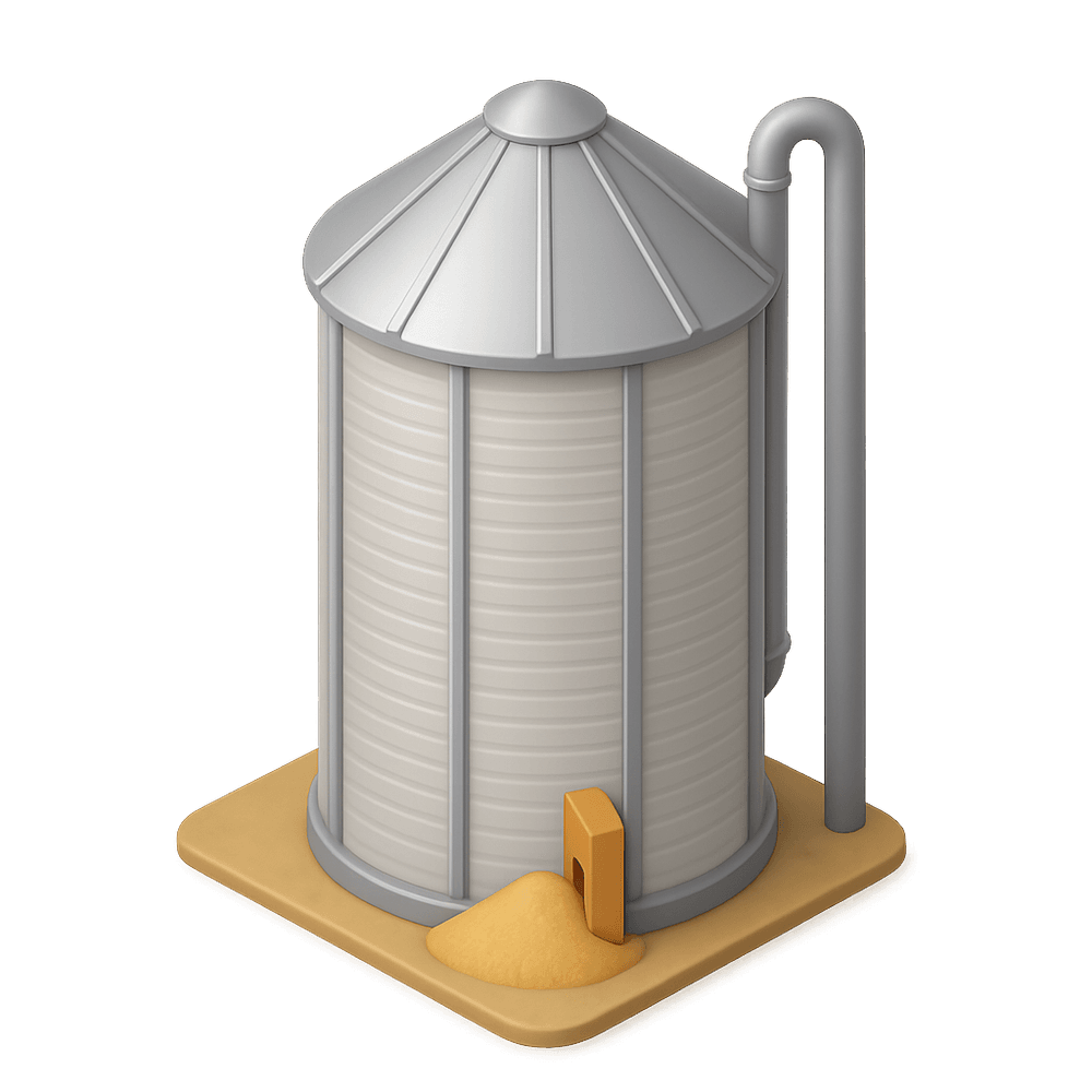 A grain silo is a tall, cylindrical structure used on farms and in agricultural facilities to store bulk materials such as grain, corn, or soybeans. It protects the contents from weather and pests, and is essential for large-scale food storage and distribution.