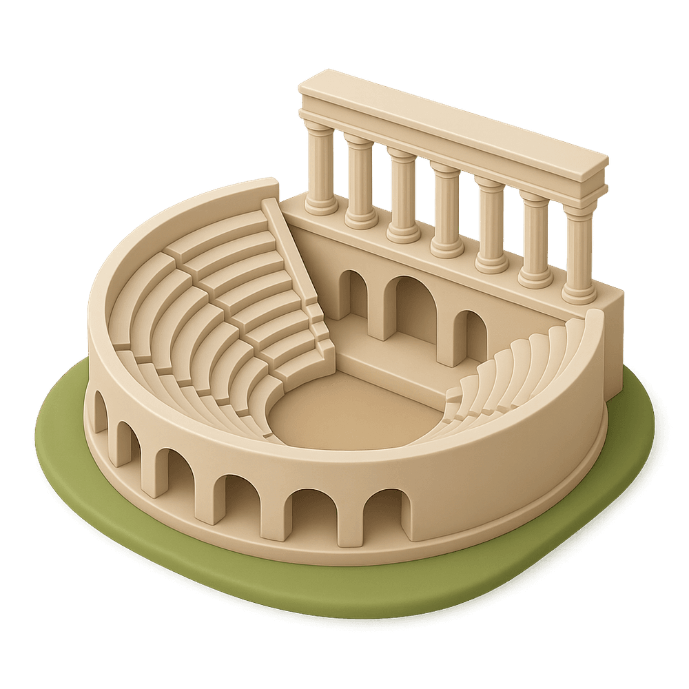 A Greek amphitheater is a large, open-air venue used in ancient Greece for dramatic performances, music, and public gatherings. Characterized by its semi-circular design and tiered seating, it is an iconic example of ancient architecture and cultural life.