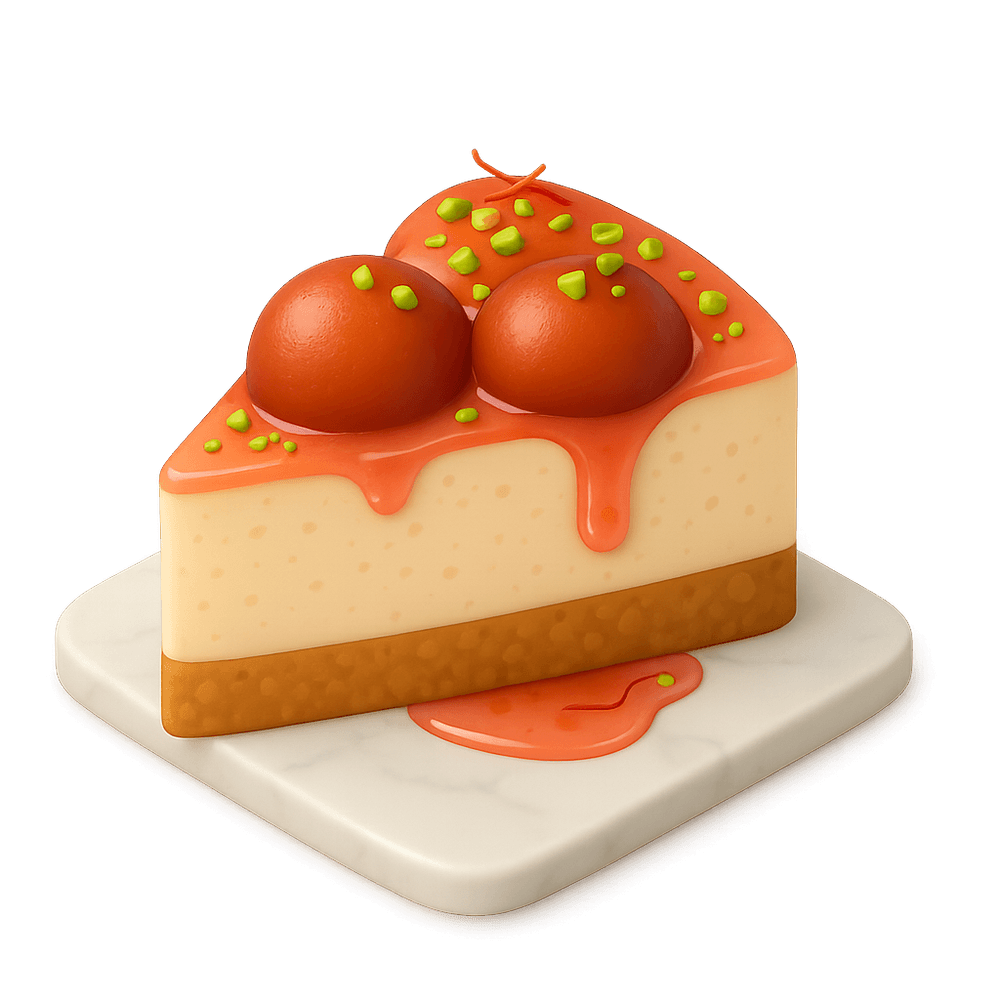A decadent dessert slice that combines the rich, syrup-soaked flavors of traditional Indian gulab jamun with the creamy texture of cheesecake, offering a fusion of East and West in every bite.