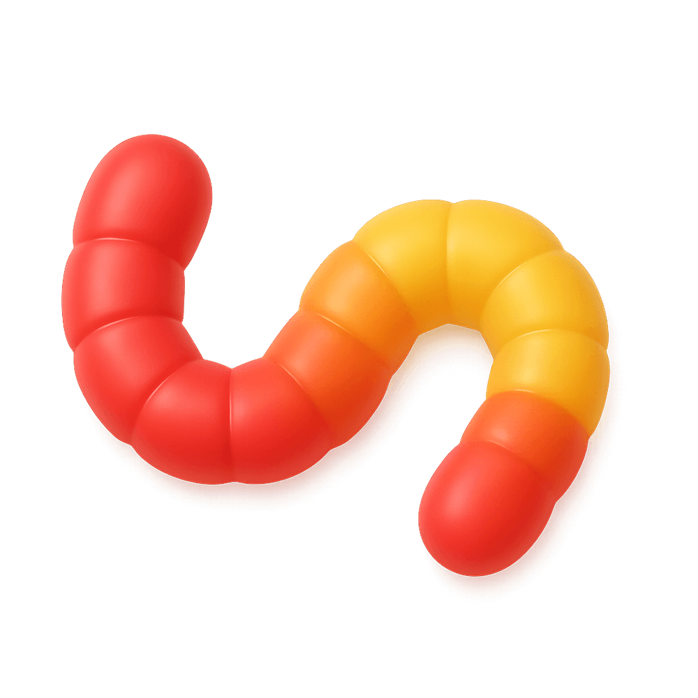 A chewy, colorful candy shaped like a worm, popular as a sweet treat and often enjoyed by children. Gummy worms are made from gelatin and come in a variety of fruity flavors.