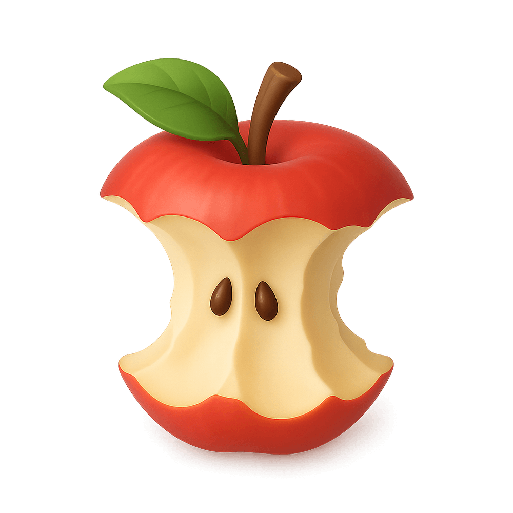 A partially eaten apple, often left behind as a snack or discarded after a few bites. It represents everyday moments, casual eating, and sometimes food waste.