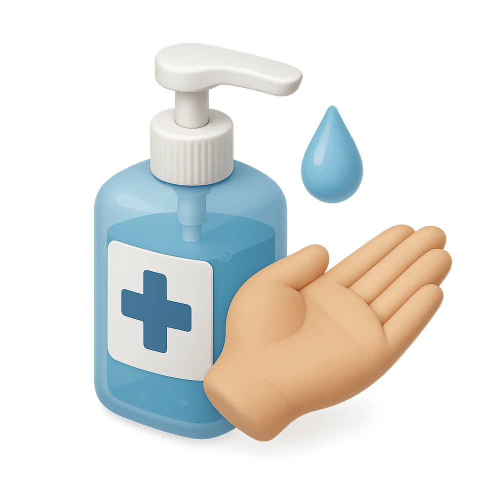 A small bottle or dispenser containing a gel or liquid used to clean hands and kill germs when soap and water are not available. Commonly found in homes, offices, and public places for quick hygiene.