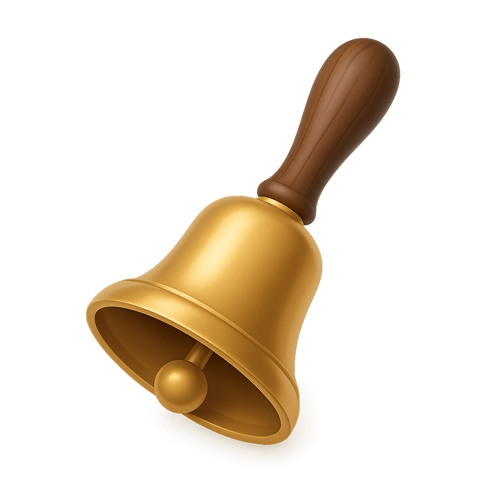 A handbell is a small bell designed to be rung by hand, often used in musical performances, ceremonies, or as a signal. It produces a clear, resonant sound and is popular in handbell choirs and festive events.