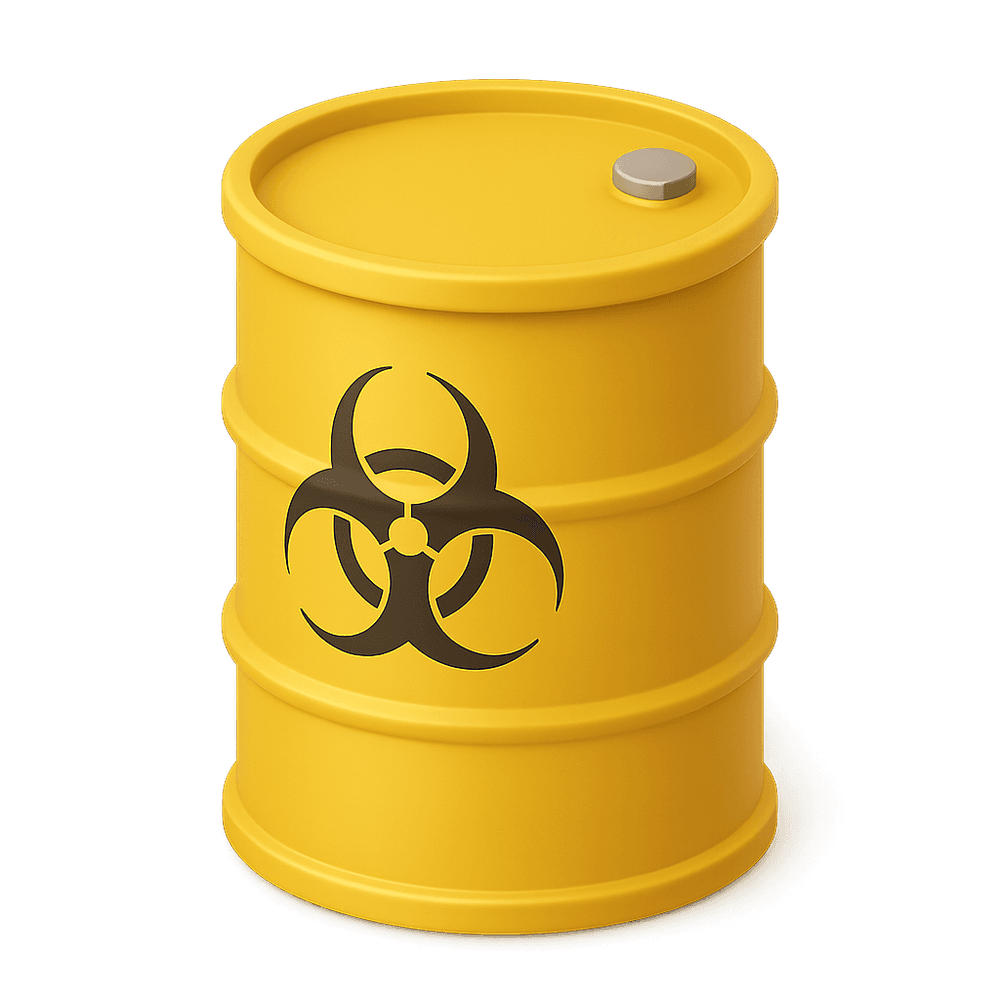 A sealed container used for storing and transporting hazardous or toxic industrial waste. Commonly found at construction sites, factories, and waste management facilities, these barrels are designed to prevent leaks and protect workers and the environment from dangerous substances.