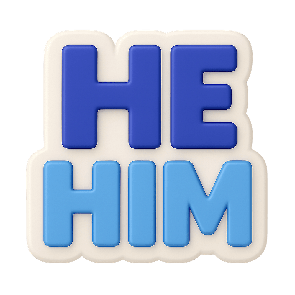 A wearable badge displaying the 'He/Him' pronouns, used to communicate gender identity and preferred pronouns in social or professional settings. Promotes inclusivity and respectful interaction.