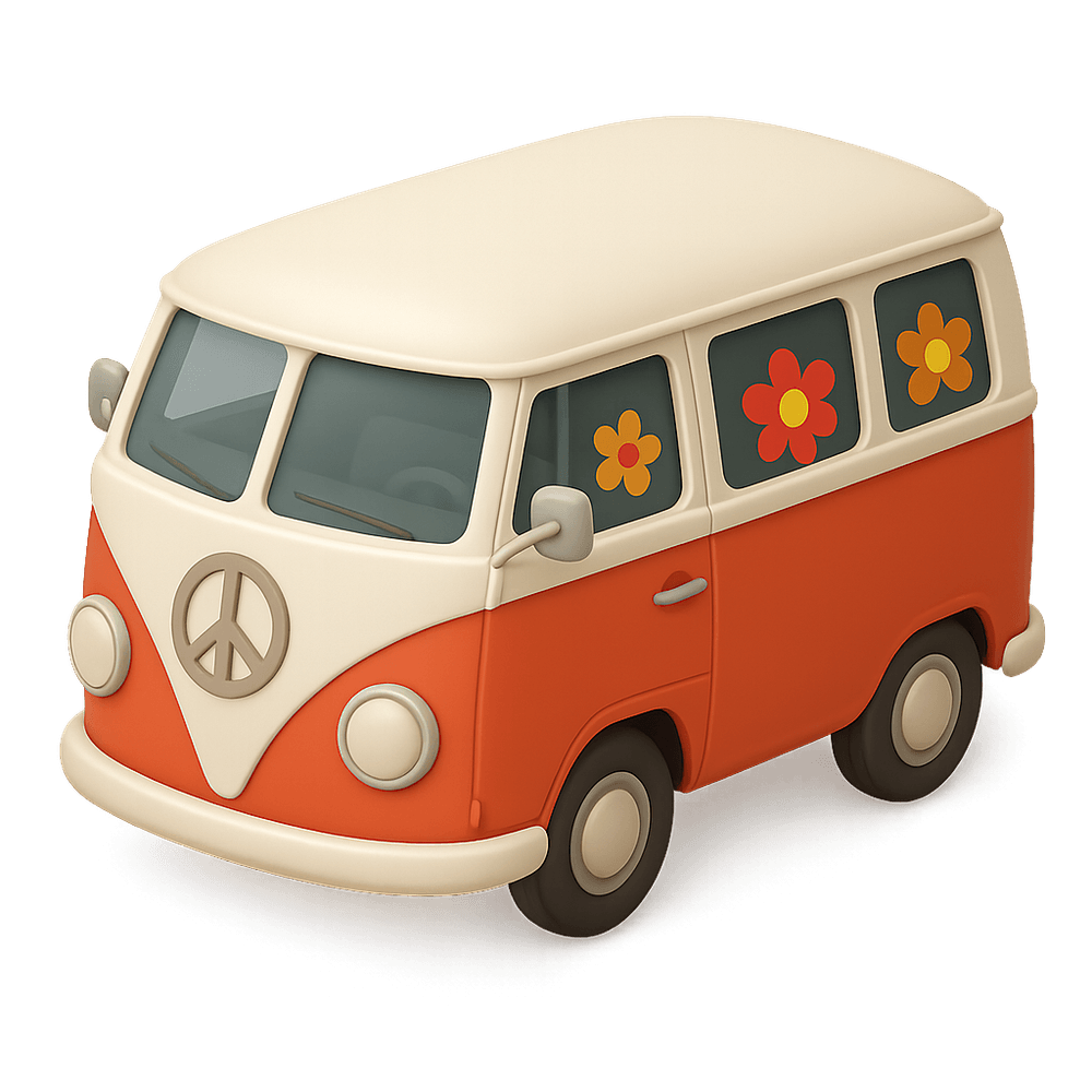 A colorful, retro-style van popularized in the 1960s and 70s, often associated with the hippie movement, road trips, and a free-spirited lifestyle. Known for its unique designs and communal travel experience.