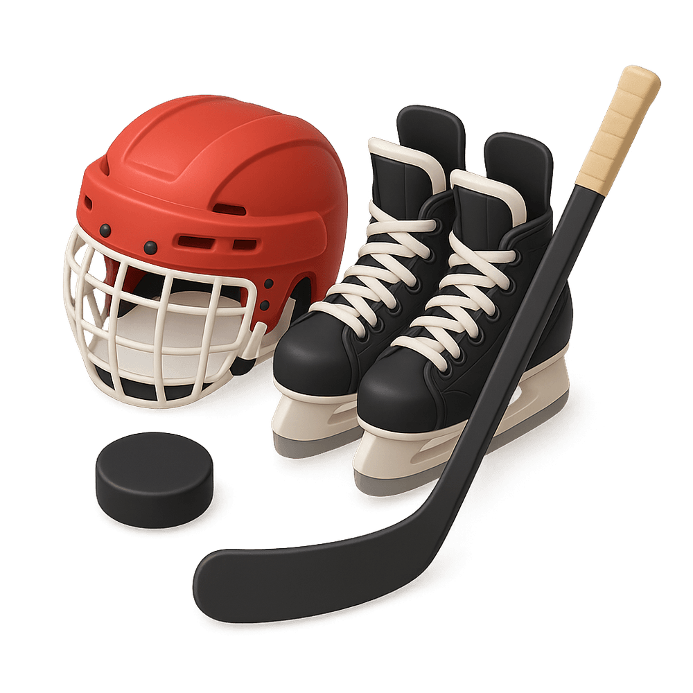 A collection of gear and protective items used by players in the sport of hockey, including skates, sticks, helmets, pads, and gloves. Essential for safety and performance on the ice or field.