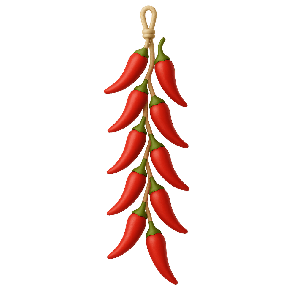 A Hot Pepper String is a decorative garland made by stringing together dried hot peppers. Often used in crafts or as a vibrant kitchen ornament, it can also serve as a traditional symbol for good luck and to ward off bad spirits in some cultures.
