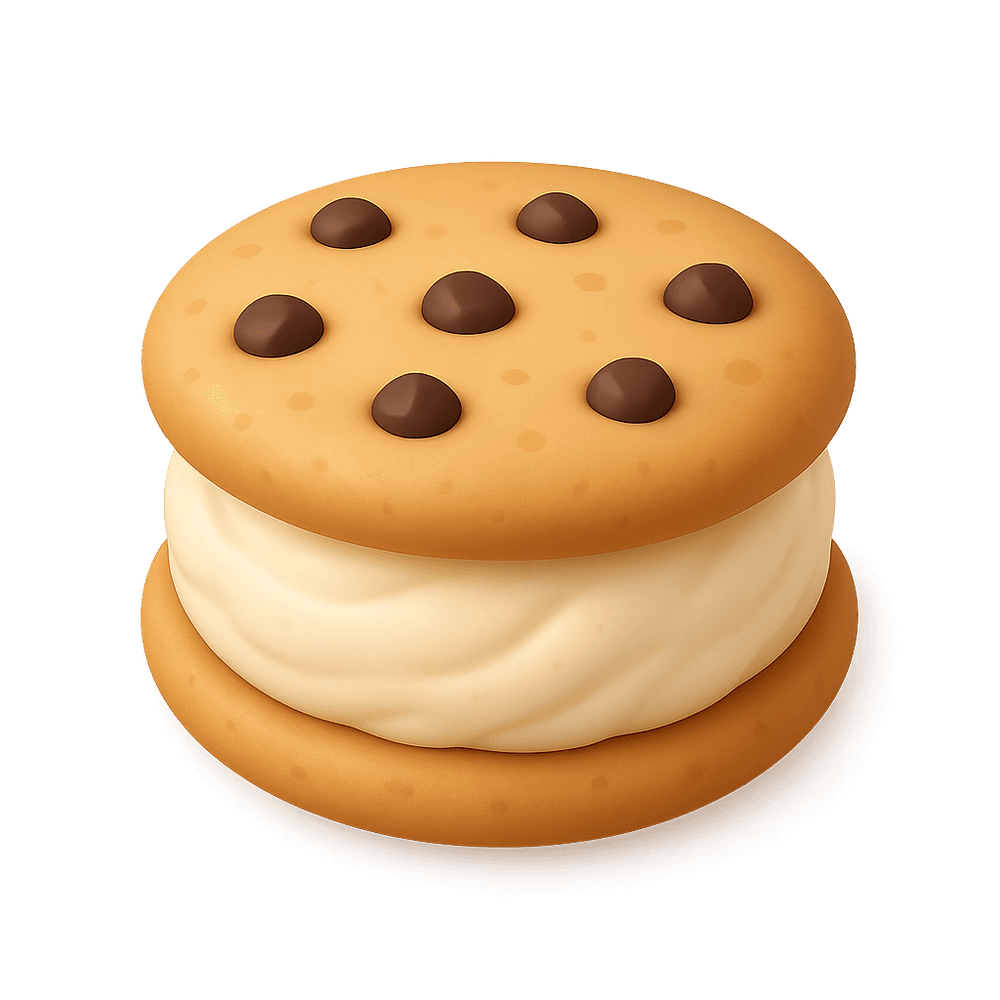 A sweet frozen dessert consisting of ice cream sandwiched between two soft cookies. Popular as a treat or snack, it combines creamy and chewy textures in every bite.