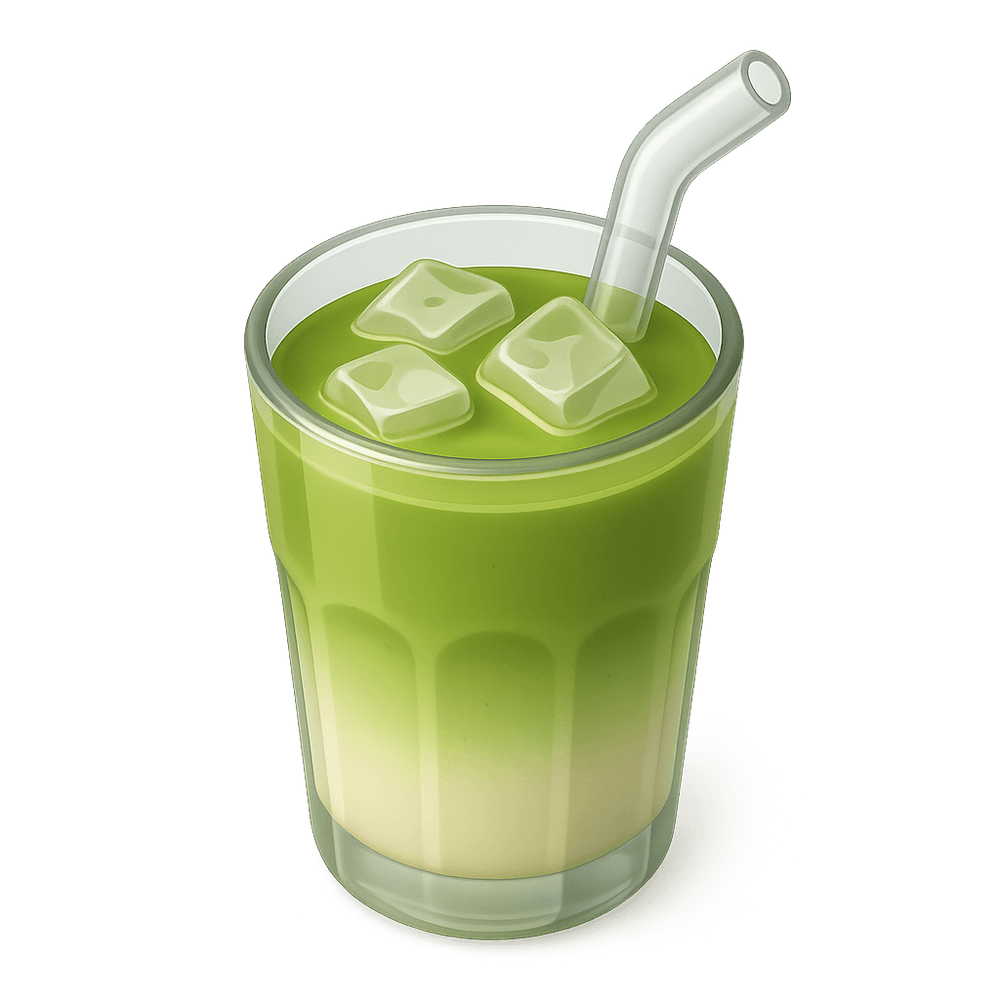 A refreshing beverage made with finely ground matcha green tea, milk, and ice, offering a creamy and energizing drink with a vibrant green color.